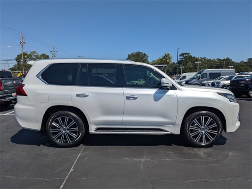 Clean CARFAX. CARFAX One-Owner. White 2021 Lexus LX 570 4WD 8-Speed Automatic with Sequential Shift 5.7L V8 DOHC Dual VVT-i 32V APPLE CAR PLAY, ANDROID AUTO, USB PORTS, BLUETOOTH, Black w/Leather Seat Trim or Semi-Aniline Leather Seat Trim, Accessory Package (Z1), Alloy Wheel Locks, Cargo Net, Carpet Cargo Mat, Front & Rear LED Courtesy Lamps w/Logo, Heated/Ventilated Front & 2nd Row Outboard Seats, Key Gloves, Luxury Package, Navigation System, Seat Air Conditioner, Semi-Aniline Leather Seat Trim, Tonneau Cover, Two Row Package.